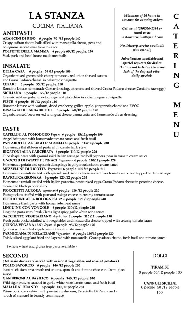For catering orders, please call us at (650) 326-1314 or email us at lastanzacucina@gmail.com We require 24 hours’ notice. Pickup only, but delivery options can be discussed.